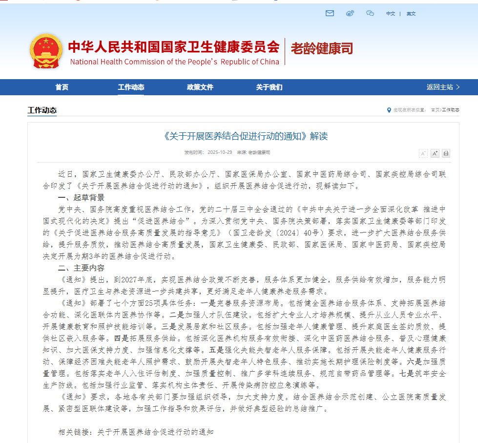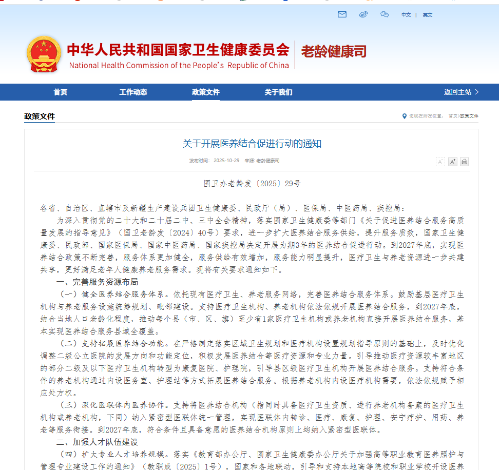 為(wei)深(shen)入(ru)貫徹(che)黨的(de)二十大和二十屆二中(zhong)、三中(zhong)全會精神,落實國家衛生健康委等部門《關于促進醫養結合服務高(gao)質量(liang)發展(zhan)的(de)指導意見(jian)》(國衛老齡發〔2024〕40號)要求,進(jin)(jin)一步(bu)擴(kuo)大醫(yi)(yi)(yi)(yi)養結(jie)合服(fu)(fu)(fu)務供(gong)給(gei),提升服(fu)(fu)(fu)務質(zhi)效(xiao),國(guo)家(jia)衛生(sheng)健(jian)康委、民政部、國(guo)家(jia)醫(yi)(yi)(yi)(yi)保(bao)局、國(guo)家(jia)中醫(yi)(yi)(yi)(yi)藥局、國(guo)家(jia)疾控局決定開展為(wei)期(qi)3年(nian)的(de)醫(yi)(yi)(yi)(yi)養結(jie)合促進(jin)(jin)行動(dong)。到2027年(nian)底,實現(xian)醫(yi)(yi)(yi)(yi)養結(jie)合政策不(bu)斷完善,服(fu)(fu)(fu)務體系更加健(jian)全,服(fu)(fu)(fu)務供(gong)給(gei)有(you)(you)效(xiao)增加,服(fu)(fu)(fu)務能力(li)明顯(xian)提升,醫(yi)(yi)(yi)(yi)療衛生(sheng)與養老(lao)資源(yuan)進(jin)(jin)一步(bu)共(gong)建共(gong)享,更好(hao)滿足老(lao)年(nian)人健(jian)康養老(lao)服(fu)(fu)(fu)務需求。現(xian)將有(you)(you)關要求通(tong)知(zhi)如下。