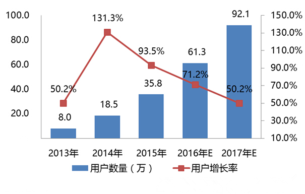 2013年(nian)~2017年(nian)中國移動CRM市(shi)場(chang)用戶規模及增(zeng)長