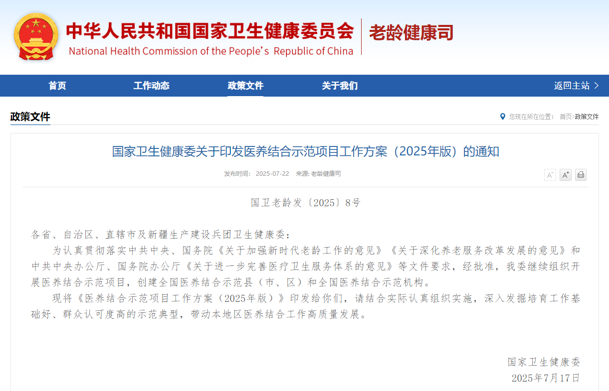 近日,國(guo)家衛生健康委(wei)印發《醫養結(jie)合(he)示范(fan)項目工(gong)作(zuo)方案(2025年版)》。現解讀(du)如下(xia):